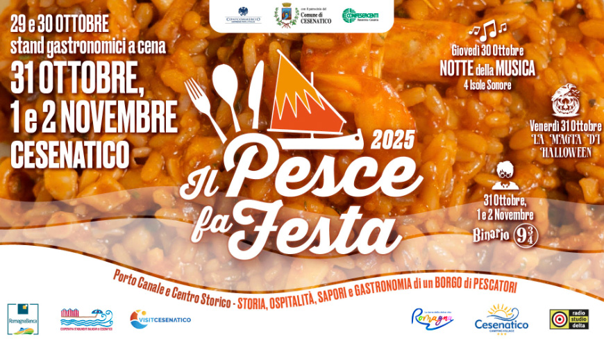 Da venerdì 31 ottobre a domenica 2 novembre 2025, Cesenatico accoglie turisti e buongustai con “Il Pesce fa Festa”, l’evento gastronomico più atteso dell’autunno, unico per atmosfera e sapori.