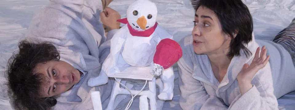 In scena due attori narrano e cantano dal vivo le avventure del celebre pupazzo di neve Snowman dall’omonimo libro a “strisce” di Jacques Duquennoy a cui l’allestimento è ispirato.