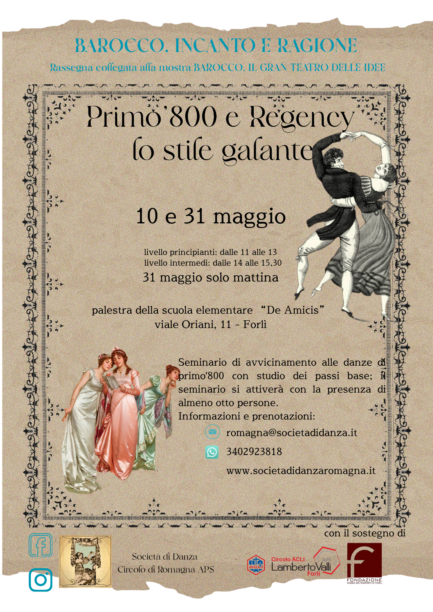 Sono previsti due incontri di avvicinamento alle danze di primo'800 e Regency in collaborazione con Acli Valli e come evento collaterale alla mostra sul barocco ai Musei San Domenico di Forlì