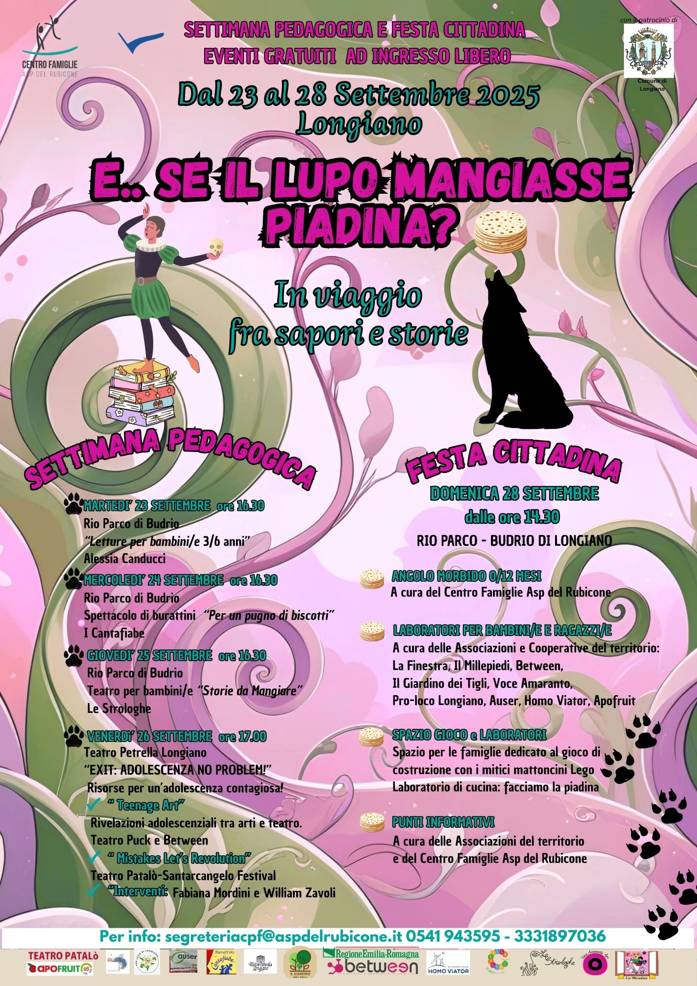 Il titolo scelto per l’edizione 2025, “E se il lupo mangiasse piadina? In viaggio fra sapori e storie”, invita a riscoprire la bellezza del racconto, del gioco e della condivisione, in un clima di creatività e inclusione.