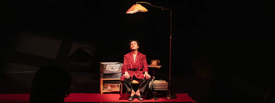 Sulla scena pochi dettagli: una poltrona, un tavolino, una lampada, un armadio e “Lui”, l’uomo che ininterrottamente parla.